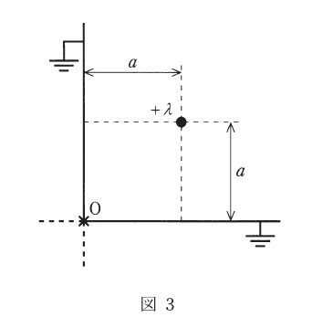 さらに、図3のように直交する2枚の接地平面があり、両平面と平行に距離 \(a\) を隔てて、線電荷密度が \(\lambda\) である無限長線電荷が置かれている。この場合、電界の境界条件を考えると、点 \(O\) における電界の大きさは(4)になる。この場合の境界条件を満たす影像線電荷を考えると、線電荷に生じる単位長さ当たりの力の大きさは(5)と求めることができる。
