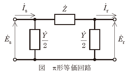 こう長が50~100kmの中距離送電線は,図のような\(\pi\)形等価回路として模擬することができる。すなわち,送電線路上の直列インピーダンス及び並列アドミタンスを(1)定数として取り扱うことが可能である。